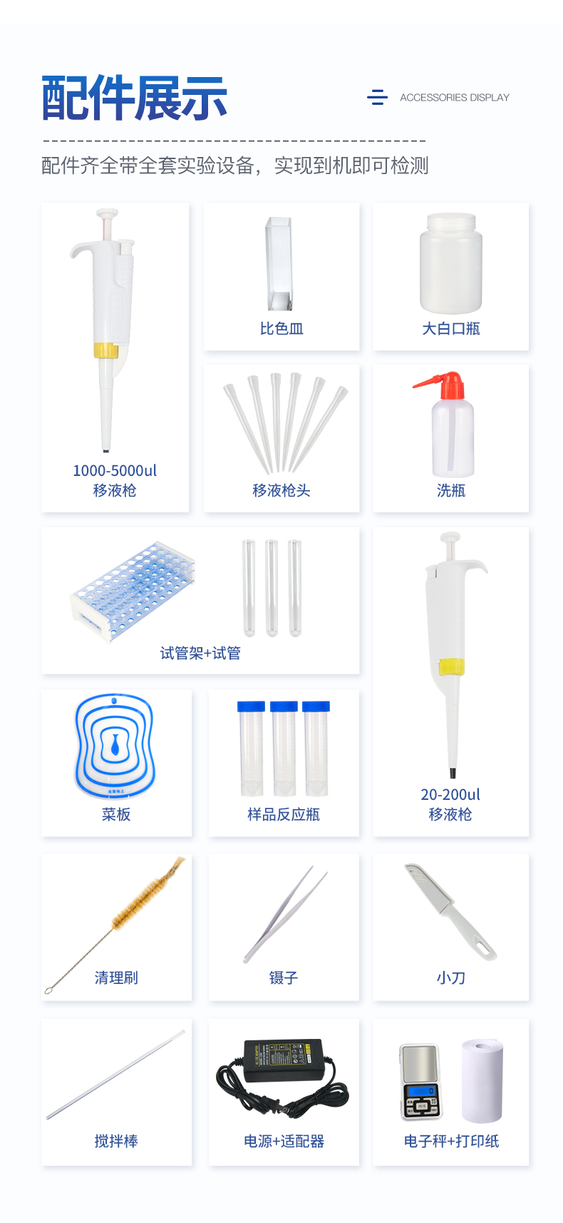 1、 檢測項目:用于快速檢測食品中吊白塊,儀器預留其他項目檢測程序和端口,根據(jù)日后需求可方便的自主增加檢測項目。日后可升級為檢測,水產(chǎn)品,肉制品,面制品的綜合類型儀器。