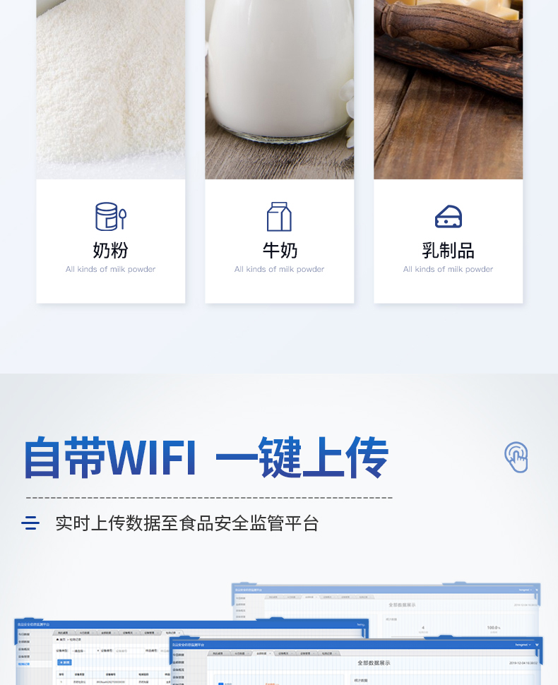 6、儀器帶有監管平臺。檢測結果可直接無線上傳。進行數據分析處理,檢測乳制品等長短期動態,達到問題預估、預警。