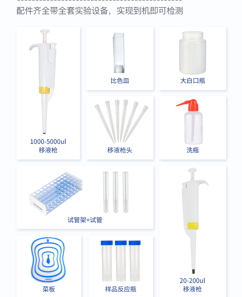 2.儀器構成:由主機、樣品前處理器具和試劑包等構成,適于現場及實驗室使用