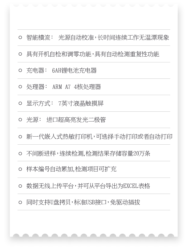 可快速檢測各類食品中的亞硝酸鹽、二氧化硫、甲醛、吊白塊、雙氧水、硼砂、農藥殘留、乳及乳制品中蛋白質、硝酸鹽、重金屬鉛的含量,儀器預留其他項目檢測程序和端口,根據日后需求可方便的自主增加檢測項目。