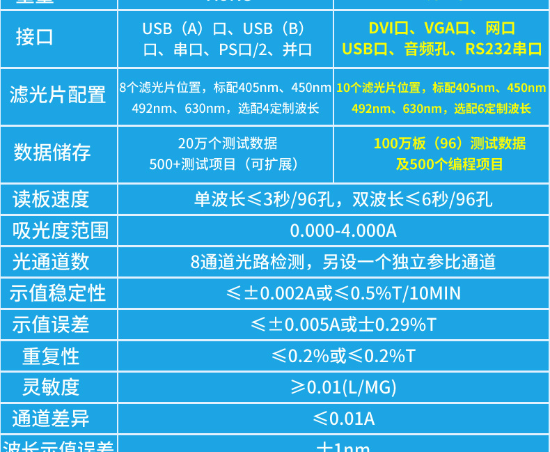*濾光片配置:10個濾光片位置,標配405nm、450nm、492nm、630nm,選配6定制波長