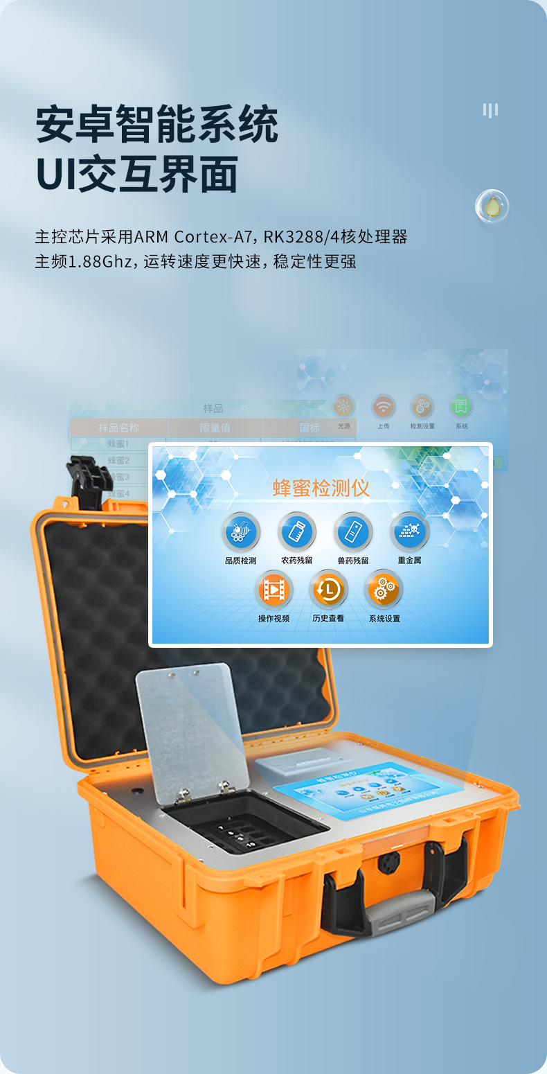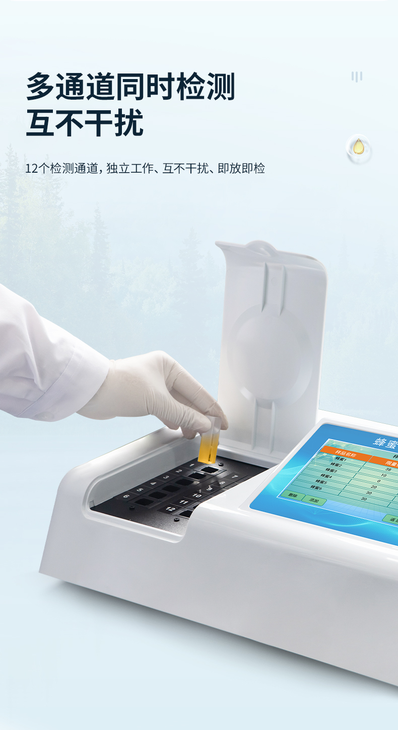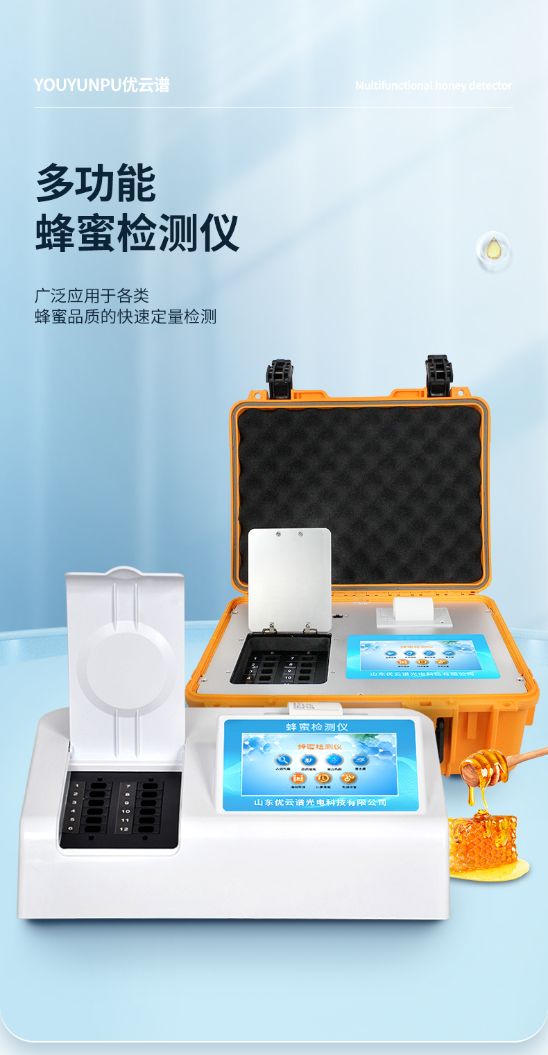 檢測項目:蜂蜜蔗糖、蜂蜜還原糖(葡萄糖和果糖)、蜂蜜羥甲基糠醛、蜂蜜酸度、蜂蜜中農藥殘留、蜂蜜淀粉酶值、蜂蜜中脯氨酸、蜂蜜水分、蜂蜜糖分、蜂蜜中重金屬(鉛、鎘、汞)、蜂蜜中抗生素(氯霉素、四環素、磺胺類、呋喃類、喹諾酮類)、蜂蜜中灰分,應用范圍:應用于現場檢測蜂蜜蔗糖、葡萄糖和果糖、羥甲基糠醛、酸度、農殘、淀粉酶、脯氨酸、水分、糖分、重金屬、抗生素、灰分含量的蜂蜜快速檢測儀,可廣泛應用于各類蜂蜜品質的快速定量檢測。
