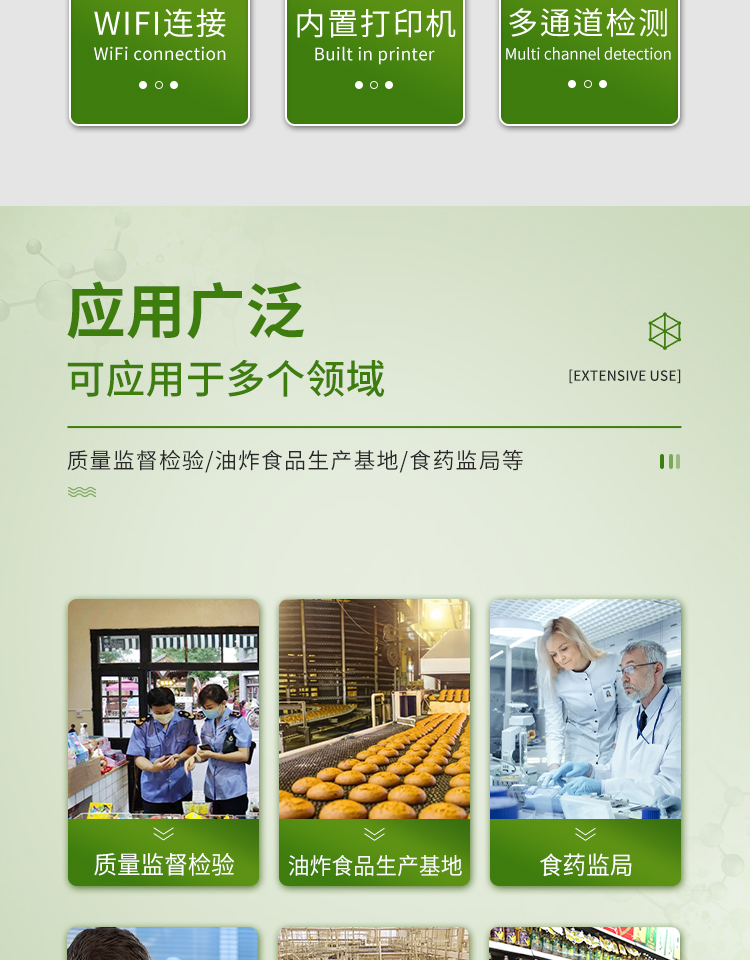 廣泛應(yīng)用于質(zhì)量監(jiān)督檢驗(yàn)、工商管理、油炸食品生產(chǎn)基地、食藥監(jiān)局、衛(wèi)生部門、肉制品食品深加工企業(yè)、商場超市、各大食品安全監(jiān)測系統(tǒng)等單位使用。