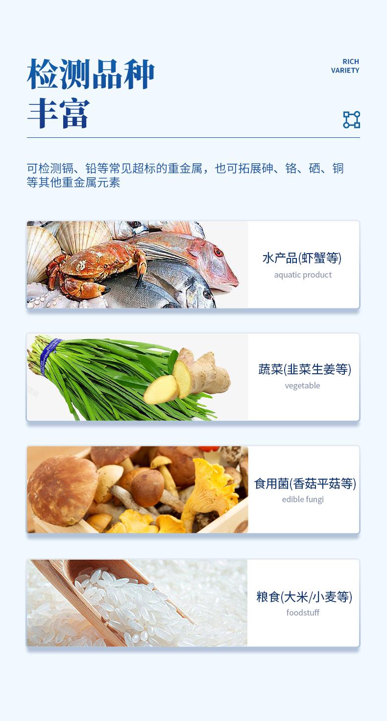 6、可檢測鎘、鉛,無機砷等常見超標的重金屬,也可拓展鉻、硒、銅等其他重金屬元素。