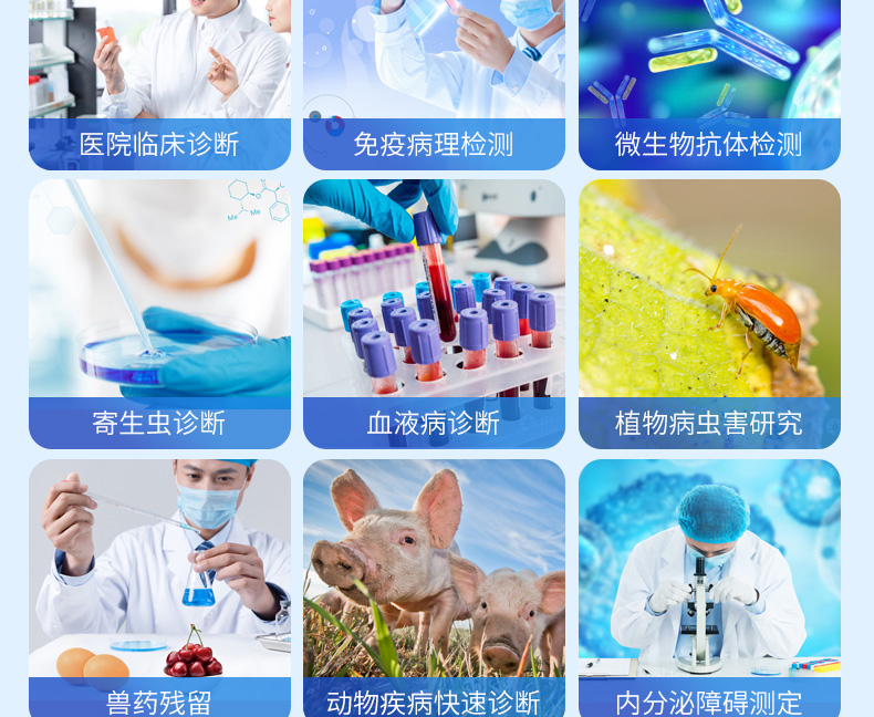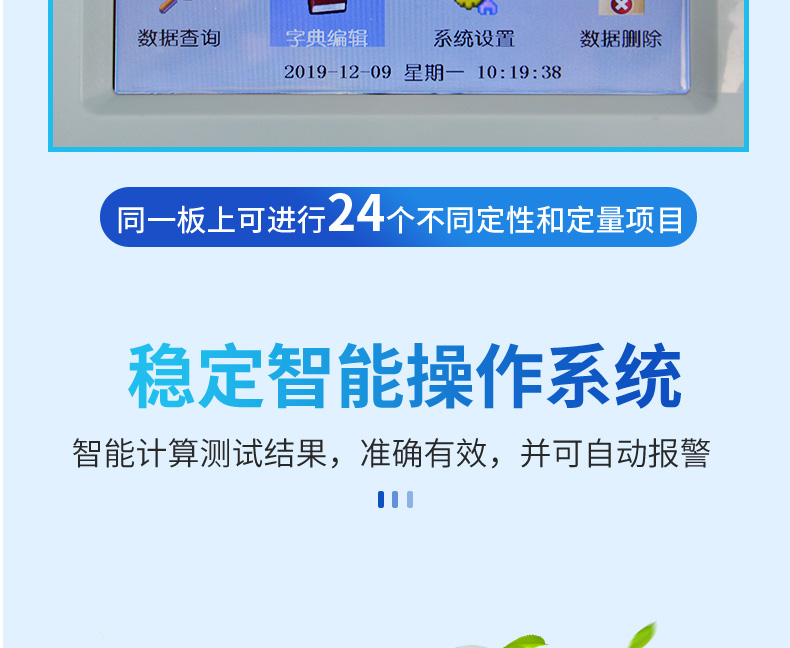 6. 在同一板上可進(jìn)行多至12個(gè)不同項(xiàng)目的測(cè)試,并可同一板檢測(cè)定性和定量項(xiàng)目。