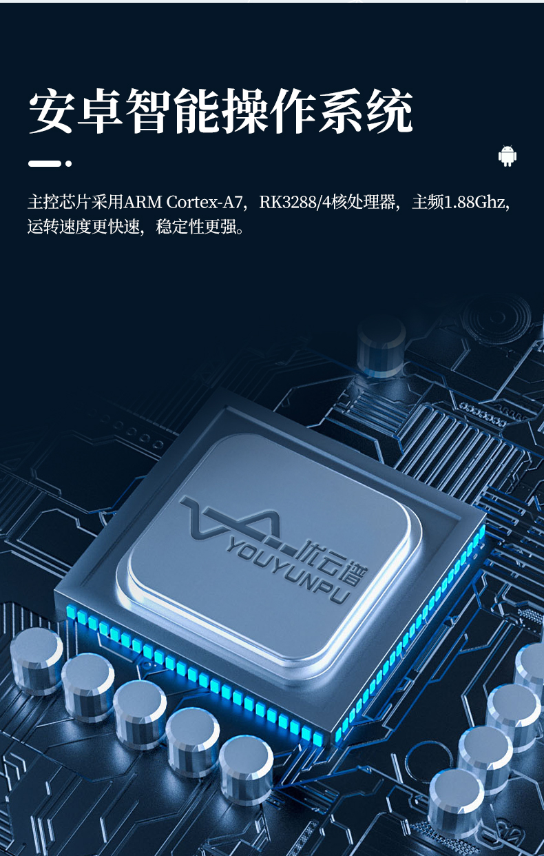 2、安卓智能操作系統(tǒng),采用更加高效和人性化操作,主控采用多核處理器,運(yùn)轉(zhuǎn)速度更快速,穩(wěn)定性更強(qiáng)。