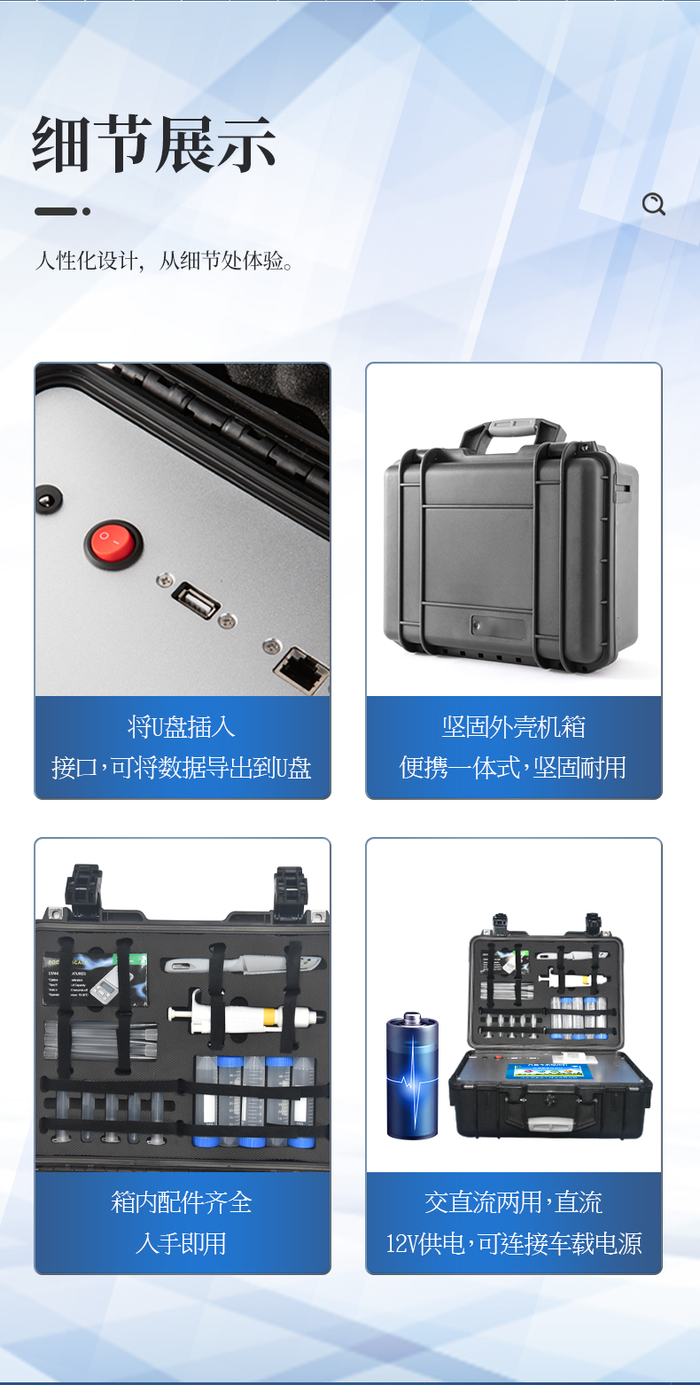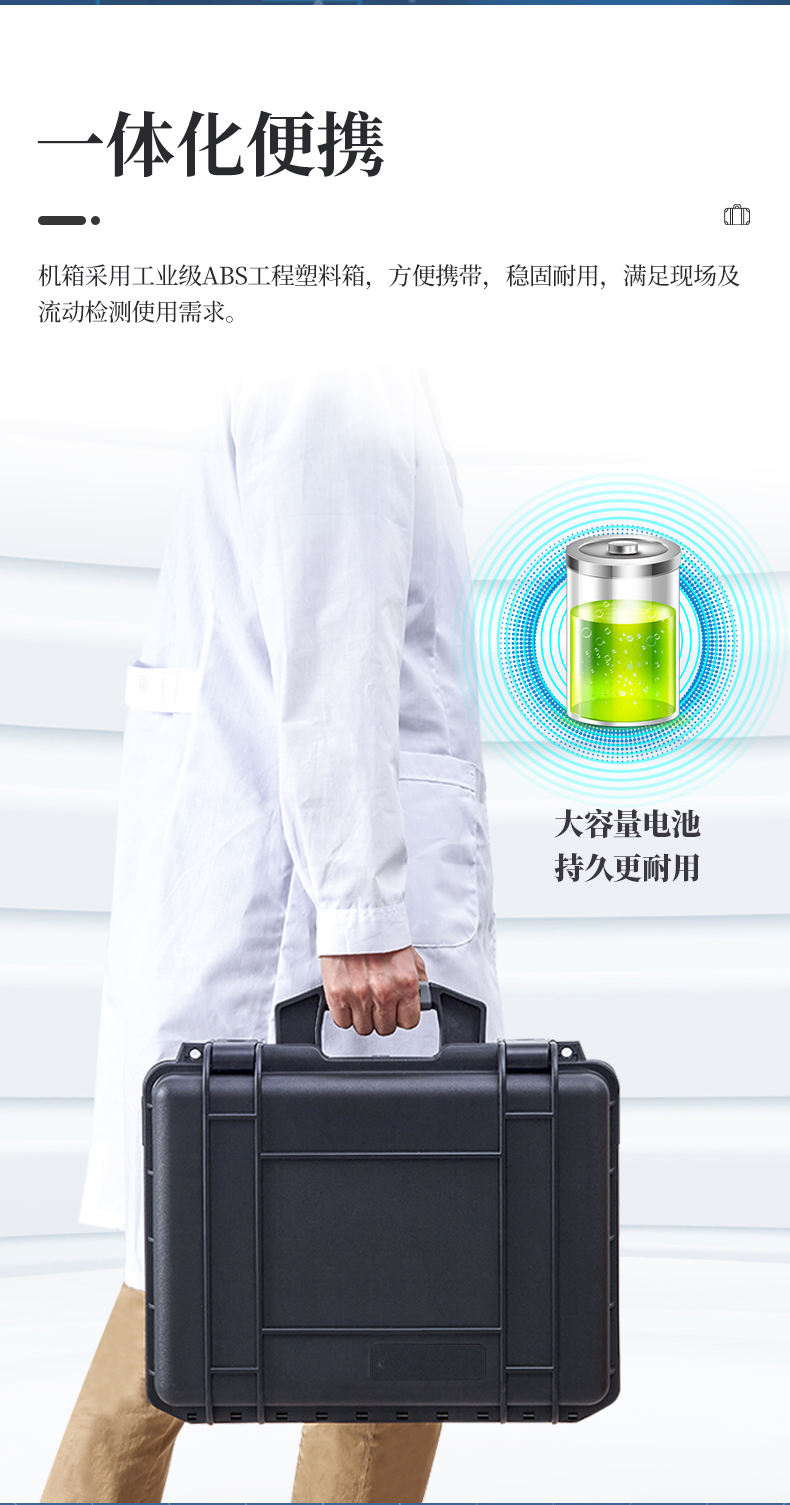 1、一體化便攜式快檢設(shè)備,機(jī)箱采用工業(yè)級(jí)ABS工程塑料箱,方便攜帶,穩(wěn)固耐用,滿足現(xiàn)場(chǎng)及流動(dòng)檢測(cè)使用需求。