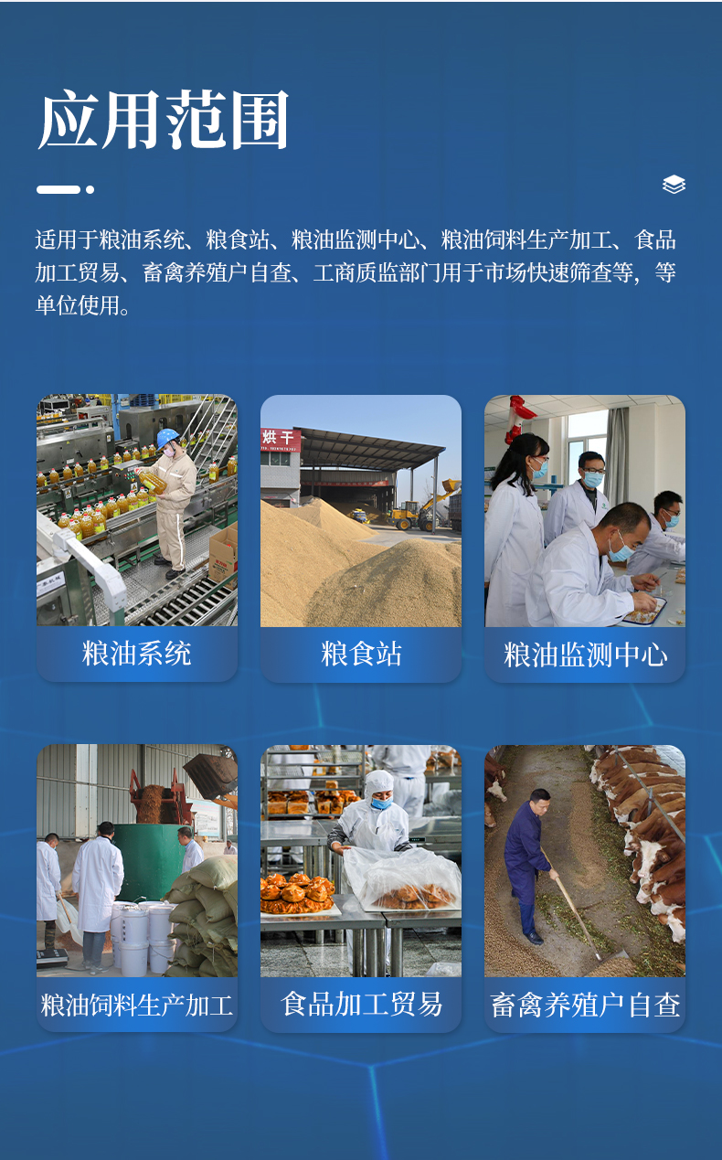 該真菌毒素檢測(cè)儀為集成化快速檢測(cè)分析設(shè)備,適用于糧油系統(tǒng)、糧食站、糧油監(jiān)測(cè)中心、糧油飼料生產(chǎn)加工、食品加工貿(mào)易、畜禽養(yǎng)殖戶自查、工商質(zhì)監(jiān)部門(mén)用于市場(chǎng)快速篩查等,等單位使用。