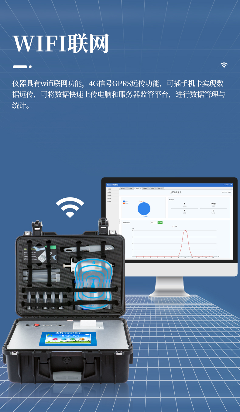 6、儀器具有wifi聯(lián)網(wǎng)功能,4G信號(hào)GPRS遠(yuǎn)傳功能,可插手機(jī)卡實(shí)現(xiàn)數(shù)據(jù)遠(yuǎn)傳,可將數(shù)據(jù)快速上傳電腦和服務(wù)器監(jiān)管平臺(tái),進(jìn)行數(shù)據(jù)管理與統(tǒng)計(jì)。