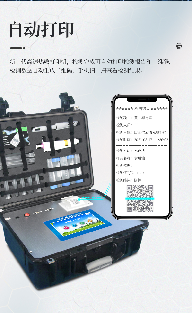 8、新一代高速熱敏打印機(jī),檢測(cè)完成可自動(dòng)打印檢測(cè)報(bào)告和二維碼。打印報(bào)告包含被測(cè)物質(zhì)、合格不合格、檢測(cè)單位、被檢查單位、檢驗(yàn)員、檢測(cè)時(shí)間。