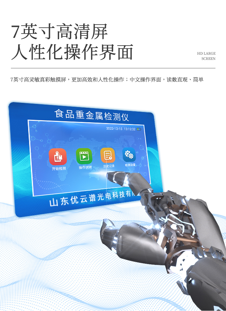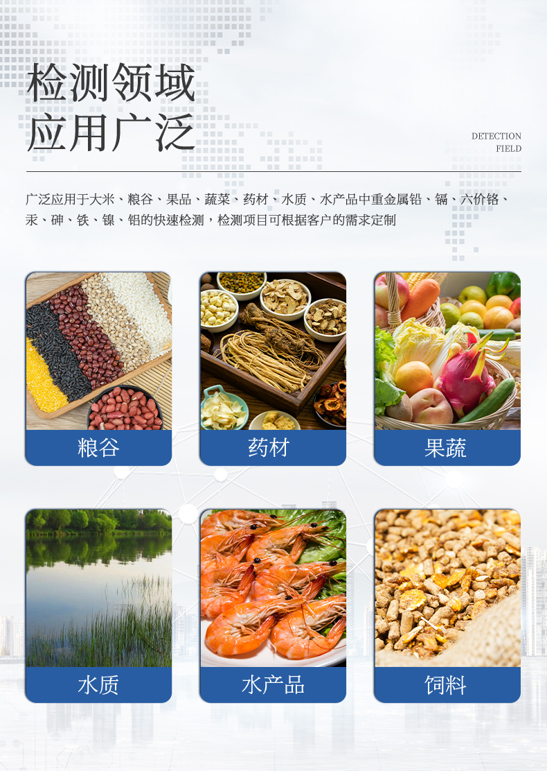 YP-TZ08重金屬檢測儀可廣泛應(yīng)用于大米、糧谷、果品、蔬菜、藥材、水質(zhì)、水產(chǎn)品中重金屬鉛、鎘、六價鉻、汞、砷、鐵、鎳、鋁的快速檢測,檢測項目可根據(jù)客戶的需求定制。