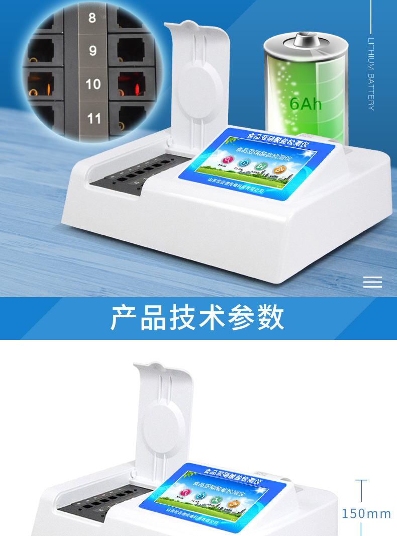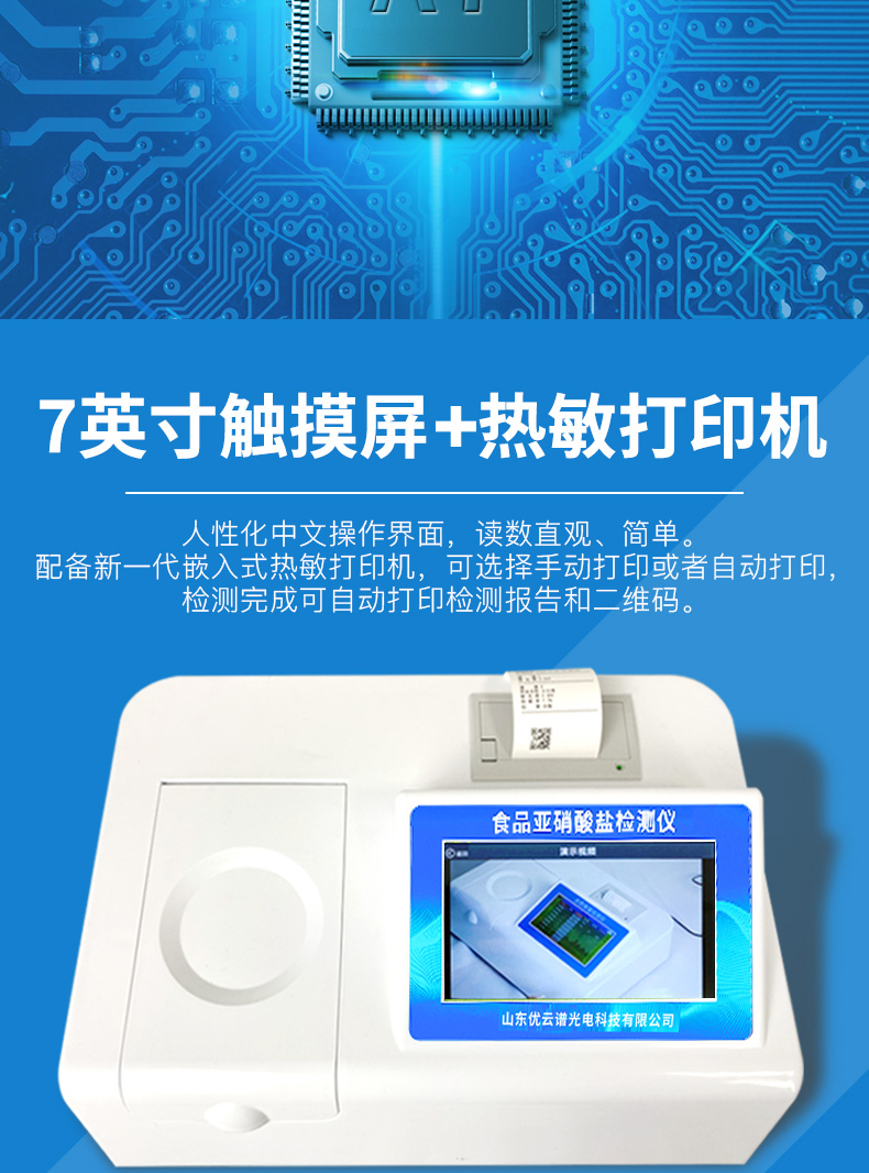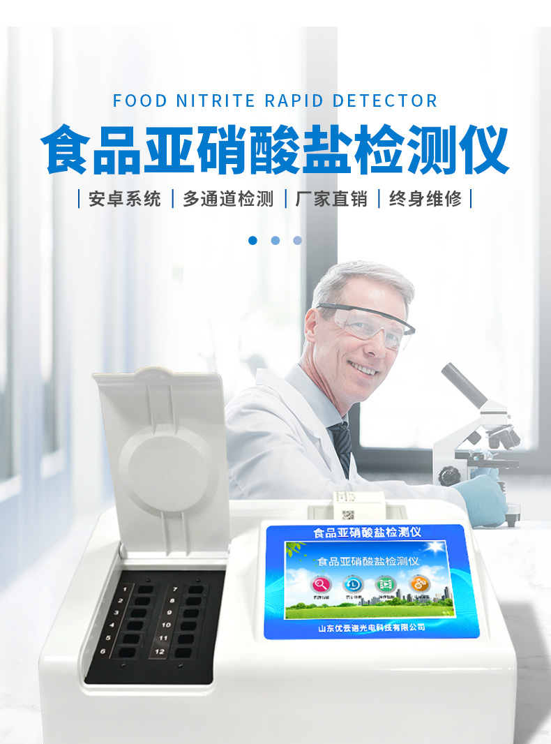 YP-Y12食品中亞硝酸鹽快速檢測儀為集成化食品安全檢測分析設備,能夠快速檢測肉類、肉類罐頭、熏肉、香腸、奶制品、泡菜、腌制蔬菜等中的亞硝酸鹽含量;該儀器是根據GB5009.33-2010《食品中亞硝酸鹽與硝酸鹽的測定》,食品中的亞硝酸鹽經過提取,與檢測試劑反應生成有色化合物,再利用亞硝酸鹽檢測儀測定其吸光度,在一定范圍內吸光度與含量成正比。通過檢測可確定食品是否符合國家標準或是否為超標毒害食品等。儀器預留其他項目檢測程序和端口,根據日后需求可方便的自主增加檢測項目。日后可升級為檢測水產品、面制品的綜合類型儀器。