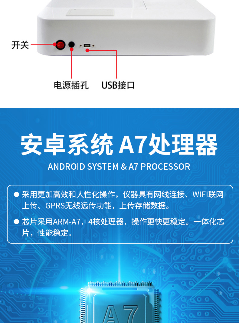 1、安卓智能操作系統,采用更加高效和人性化操作,儀器具有網線連接、wifi聯網上傳、GPRS無線遠傳功能,快速上傳數據。